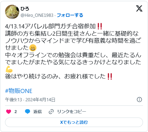 森谷和正さんは、現在も物販スクール「物販ONE」を手がけており、これまでに多くの受講生がそこで成果を出しています。