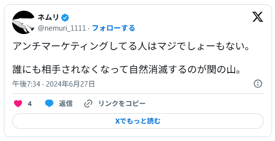 実際にXでも「アンチマーケティングに注意!」といった声が上がっています。
