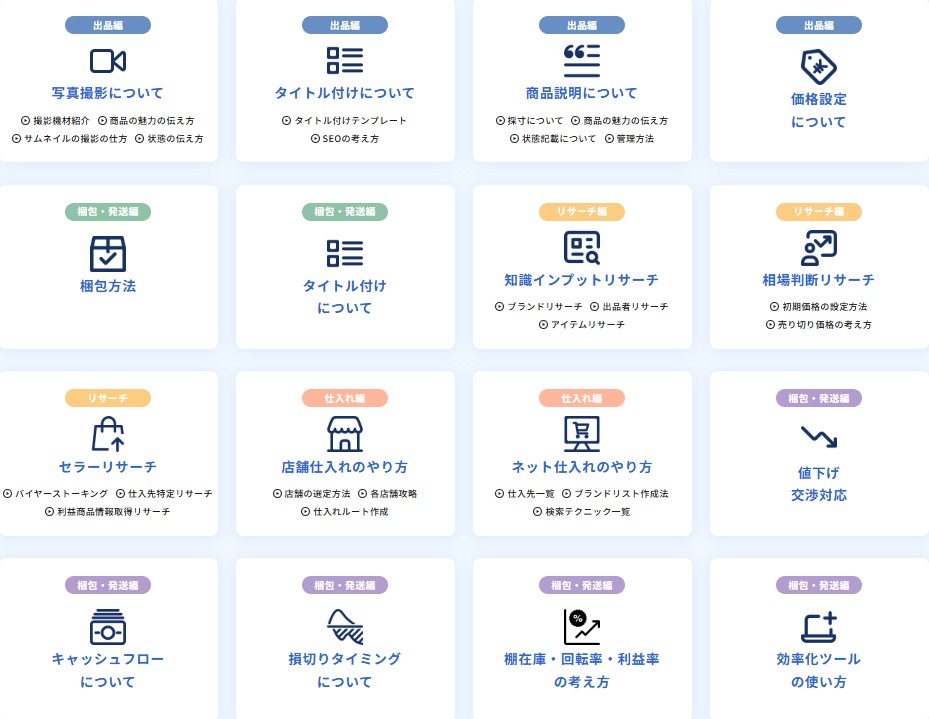 特徴の一つは、基礎からせどりの仕組みや売れる商品などの特徴を学べるカリキュラム構成になっていることです。