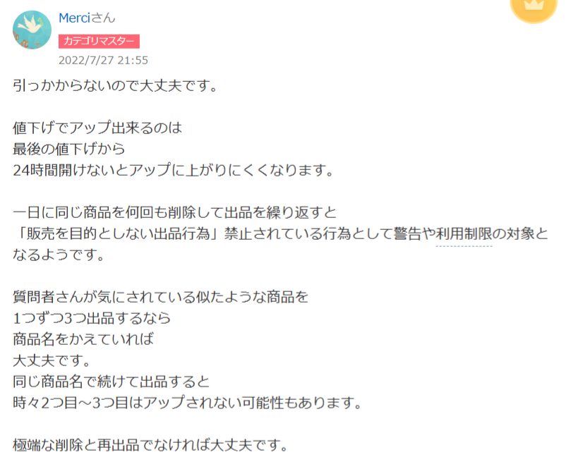 例えば、24時間以内に何度も同じ商品を再出品すると危険ですが、3日〜1週間あければ通常利用の範囲になります。