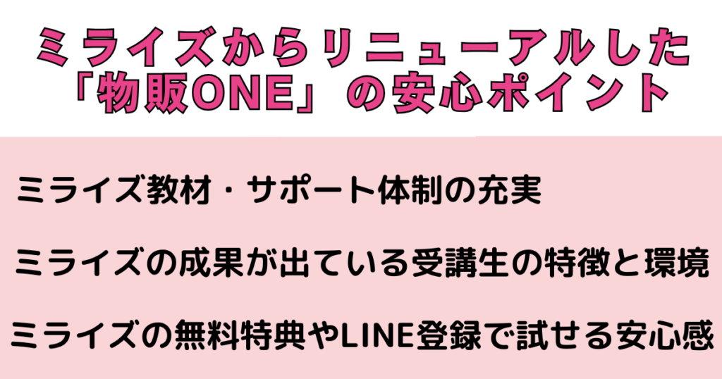 ミライズ(現・物販ONE)は名称を「物販ONE」に変え、運営体制やサポート内容を見直しながらリニューアルされました。