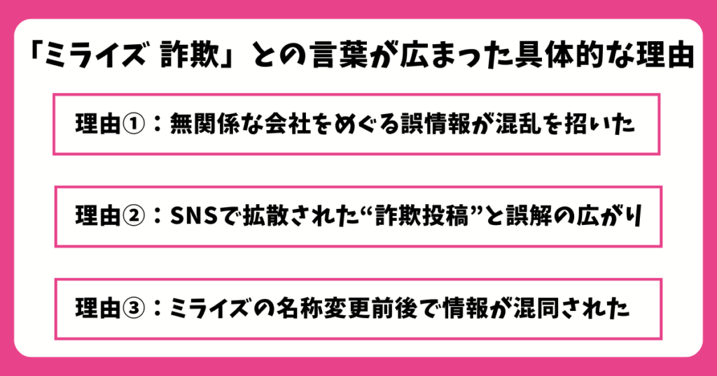 SNSや口コミで「ミライズ 詐欺」との言葉が広まった背景には、明確なきっかけがあります。