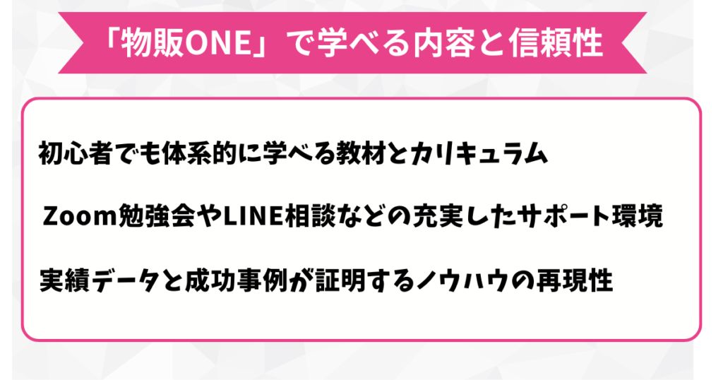 ここでは、物販ONEで学べる点と、信頼性を考えるうえで押さえておきたい部分を整理します。