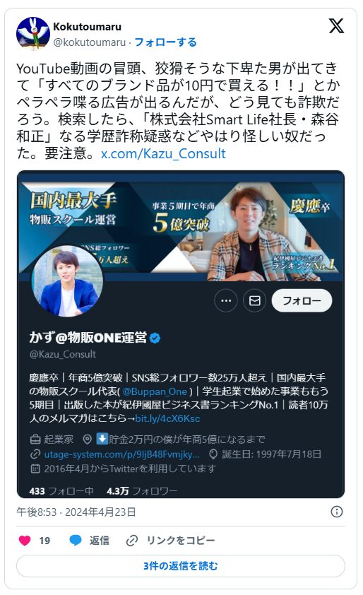 XをはじめとするSNSでは、「森谷和正は怪しい」「詐欺っぽい」といった投稿が散見されています。