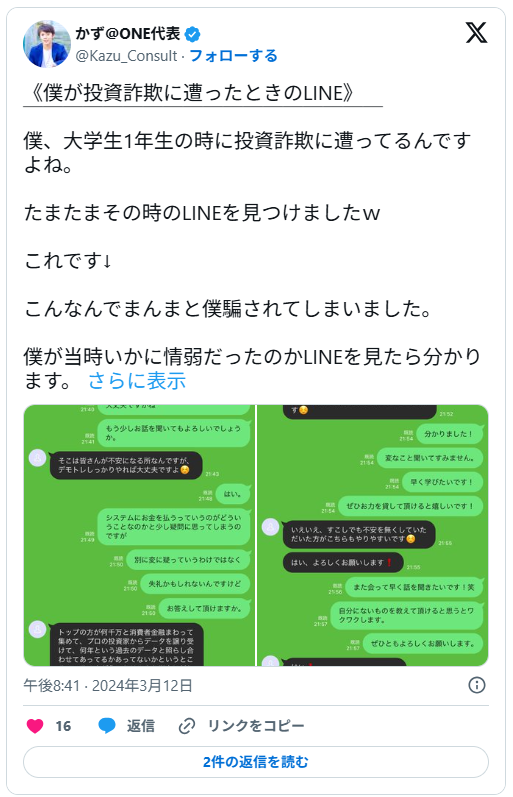 慶應義塾大学に在学中に投資詐欺にひっかかり、35万円を失います。